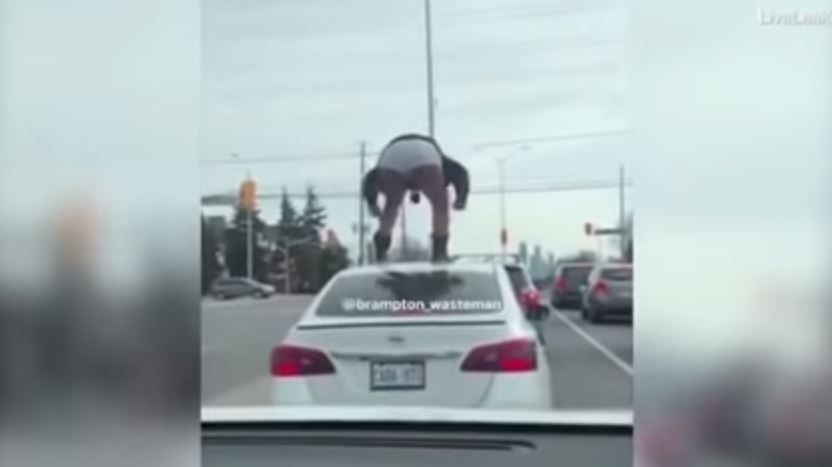 Eso fue lo que ocurrió con una mujer que sorprendió a varios conductores que transitaban en una carrertera cuando se dieron cuenta que viajaba, como “polizón”, sobre el toldo de un auto que manejaba un hombre, aparentemente su pareja, semidesnuda, pues solo llevaba puesto un abrigo y pantaletas.