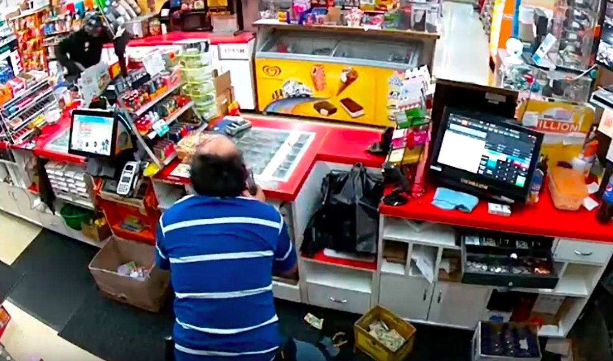 Uno de ellos salta el mostrador y ataca al empleado, identificado como Mark Kasprowicz. El asaltante golpea al trabajador en la cabeza y empieza a tomar el dinero.