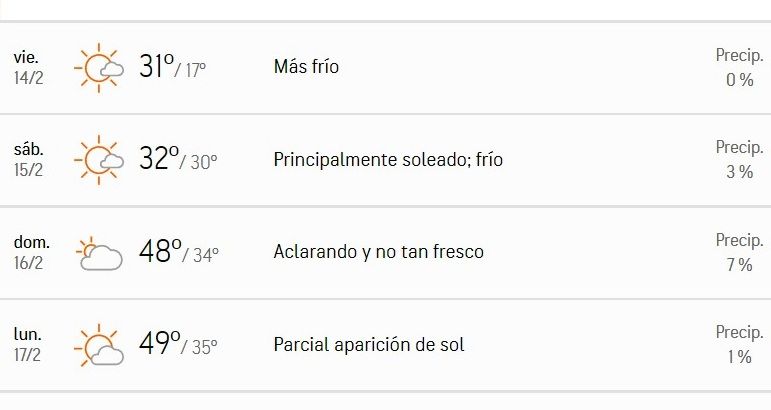 Serán días parcialmente soleados, sin pronóstico de lluvia ni nieve.