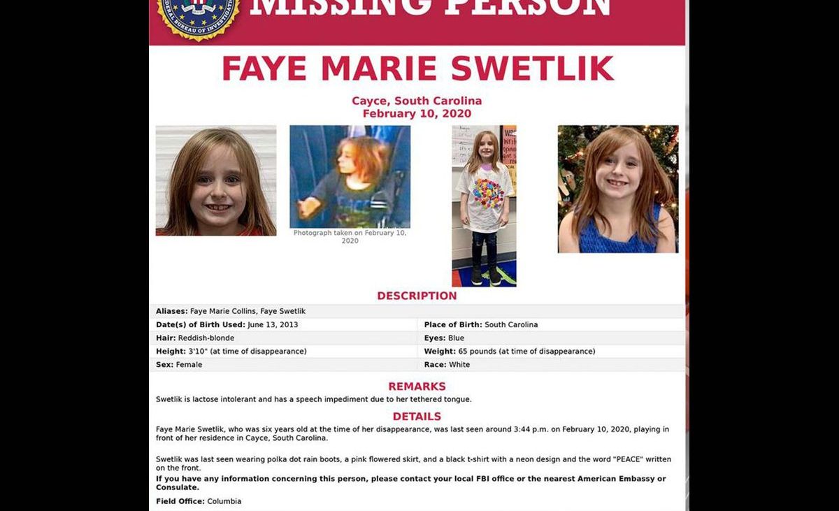 El cadáver de Faye Swetlik fue hallado la semana pasada en South Carolina