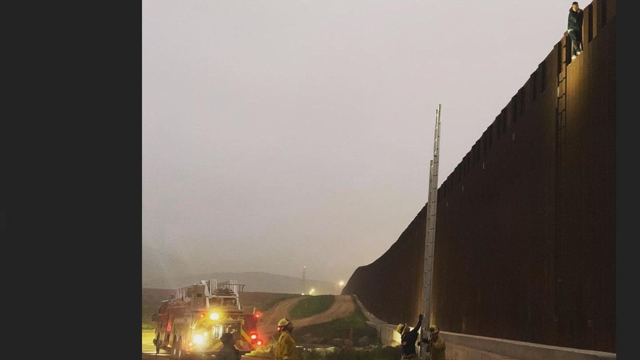 Un hombre que subió a lo alto del muro fronterizo en San Diego, California, tuvo que ser rescatado por los bomberos al no poder bajar.