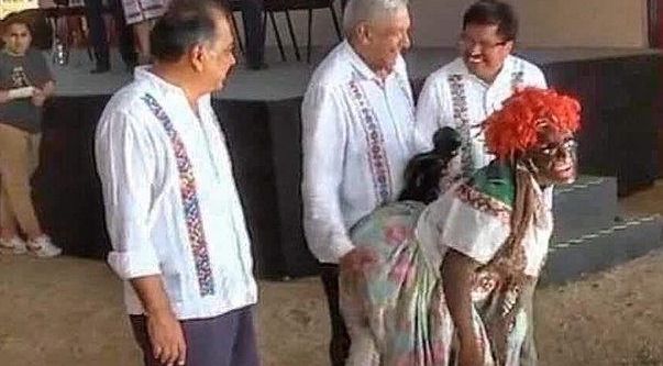 El que representa a la mujer, llamado “La Minga”, se acercó a López Obrador y se movió sugestivamente frente al mandatario, quien siguiendo el ambiente de furor, le tocó “el trasero”, acción que fue duramente criticada en las redes sociales.