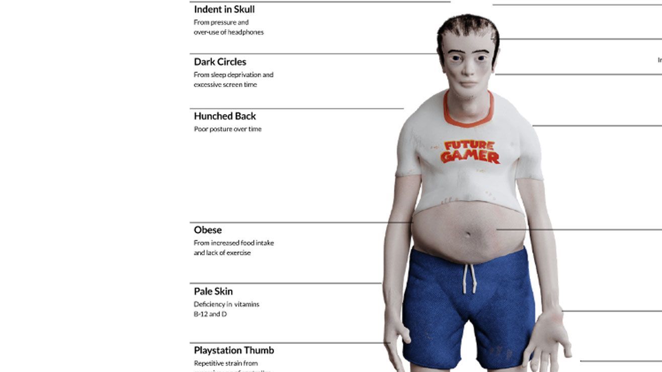 Los brazos y piernas del gamer del futuro tienen eccema (manchas rojas) a causa del estrés y una postura doblada de manera permanente. Además, presenta vista cansada, pulgares lastimados, padece de falta de sueño y una deshidratación importante.