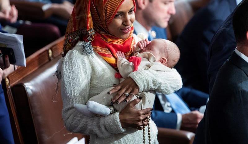 La representante demócrata Ilhan Omar sostiene a su hijo en brazos antes del inicio del 116º Congreso estadounidense.