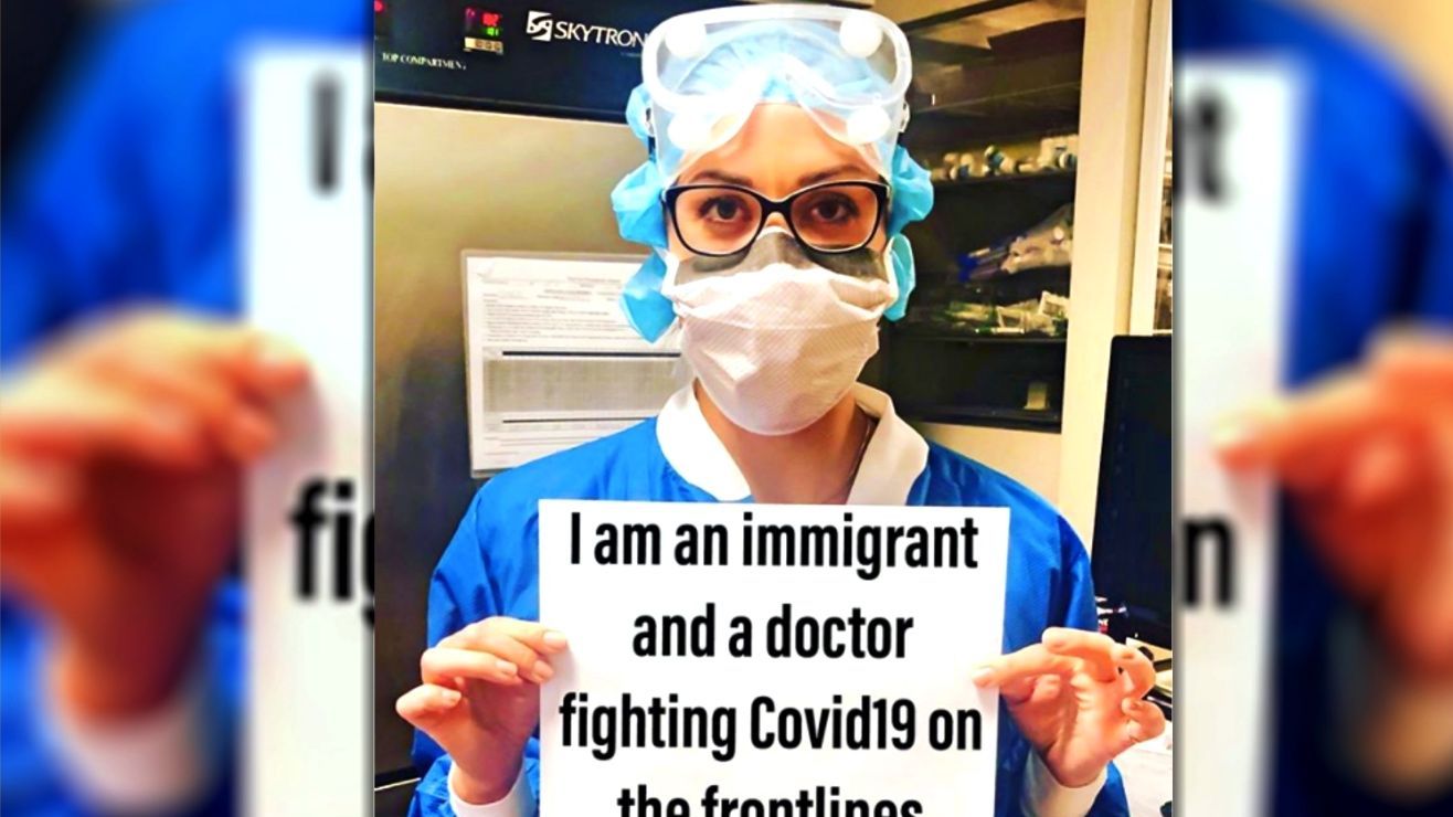 Julia Iafrate, una doctora de un hospital de Nueva York que trabaja como voluntaria en el frente de batalla contra el coronavirus, publicó el pasado 6 de mayo en su cuenta de Instagram su fotografía sosteniendo un letrero en el que se lee: “Soy una inmigrante y una doctora combatiendo el COVID-19 en primera línea”.