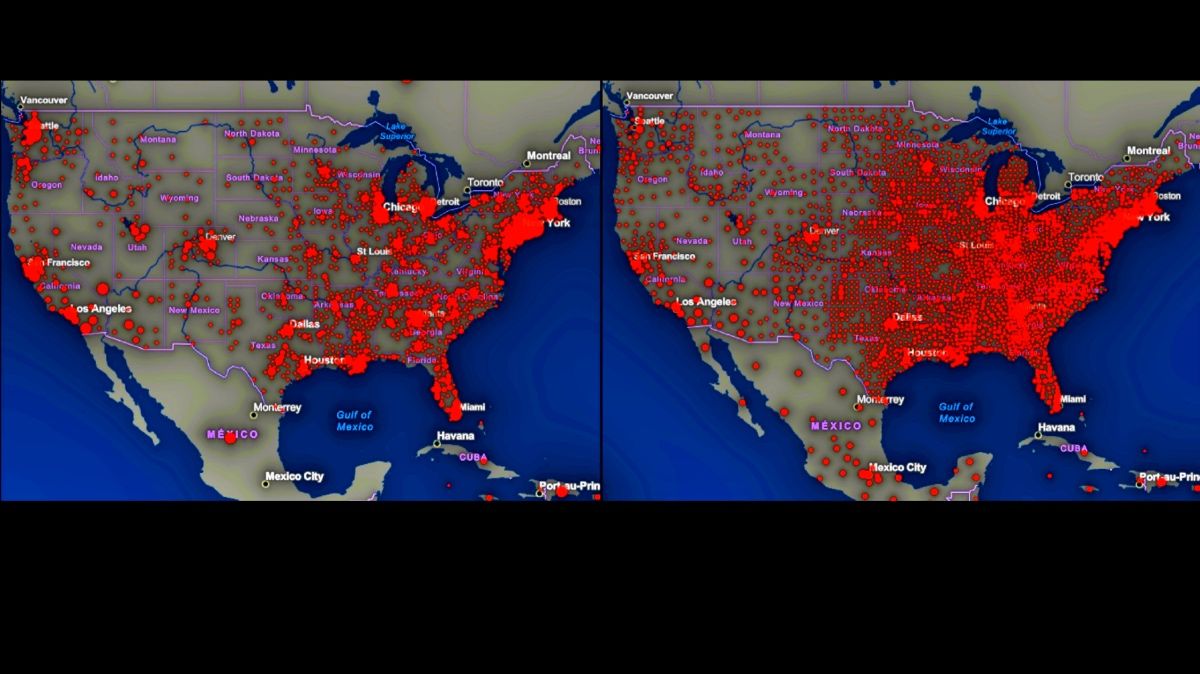 El mapa de la izquierda corresponde al 24 de marzo, cuando se habían reportado casi 55,000 casos y el número de muertos todavía no llegaba a 800.