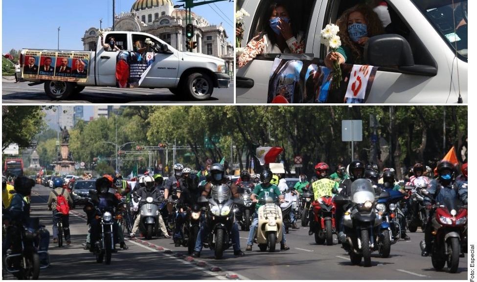 A finales de mayo se dio la primera protesta sobre vehículos cuando cientos de conductores avanzaron en caravana y tocaron las bocinas de sus autos las avenidas principales de la Ciudad de México y otras del país donde exhibieron pancartas con la consigna de la marcha.