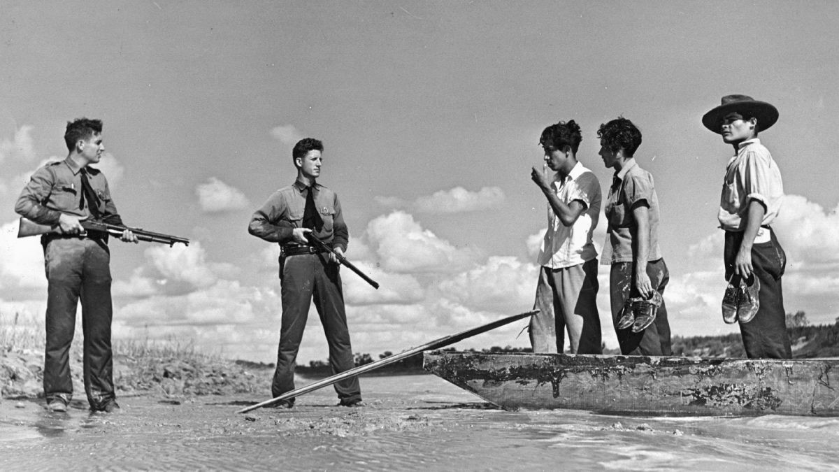 Patrulla Fronteriza detiene a tres mexicanos en el río Bravo en 1948. Crédito: Harry Pennington / Keystone Features | Getty Images