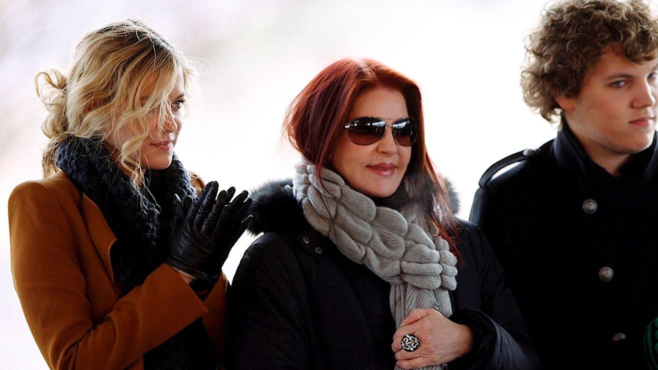Priscilla Presley en el centro acompañada a cada lado por sus nietos Riley y Benjamin Keough. Crédito: LANCE MURPHEY | EFE
