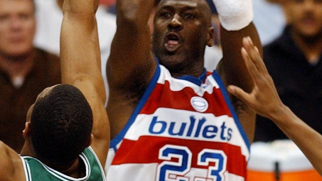 Michael Jordan el día que jugó con un jersey de los Washington Bullets en 2003. Crédito: HEATHER HALL/AFP | Getty Images