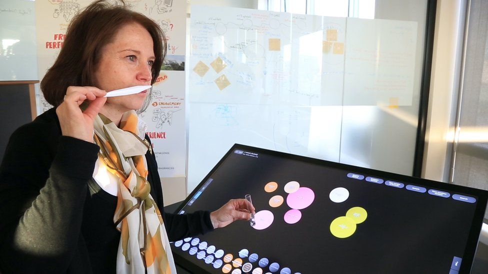 Usando una pantalla táctil, el perfumista puede reunir diferentes aromas utilizando datos de la amplia biblioteca de fórmulas de fragancias de la marca, un proceso mucho más eficiente que el uso de hojas de cálculo.