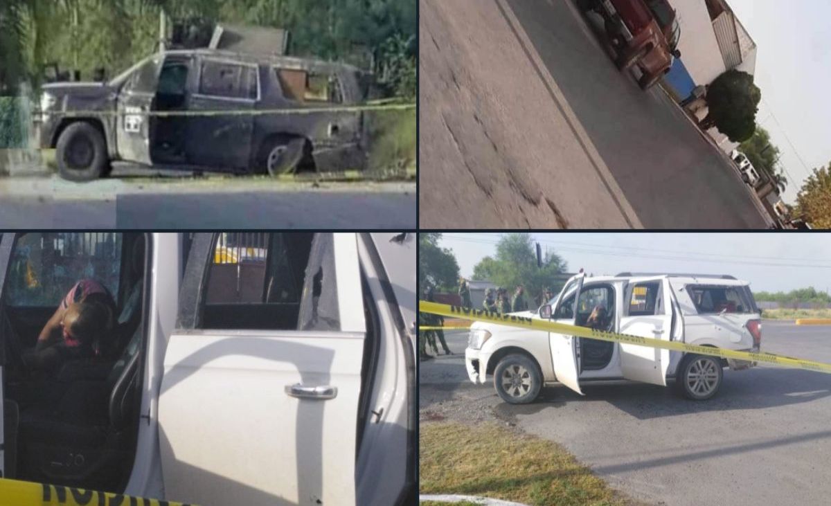 En las imágenes que circulan en redes sociales aparecen camionetas con las siglas del Cártel del Golfo, mientras que en otras solo se aprecian camionetas en donde al parecer hay integrantes de grupos criminales sin vida.