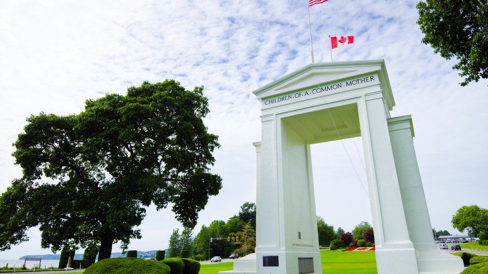 El Arco de la Paz, un monumento de unos 20 metros de alto, se levanta exactamente en el límite entre ambos países: donde termina la ciudad de Blaine, en el estado de Washington, y comienza la ciudad de Surrey, en la provincia canadiense de Columbia Británica.