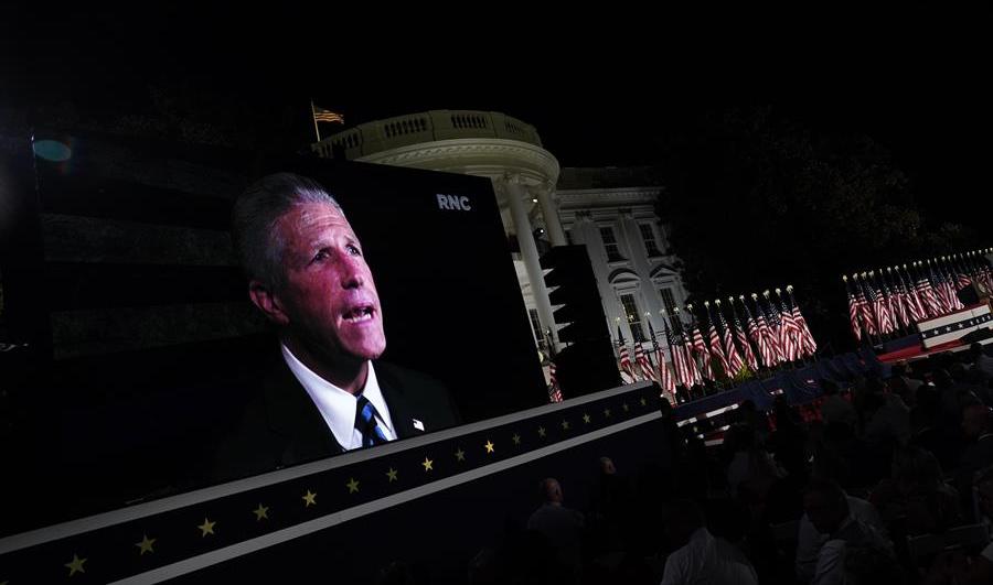 Sus palabras siguieron a las de Pat Lynch, presidente de la Asociación Benevolente de la Policía de Nueva York (PBA), quien poco antes apareció en un monitor gigante dirigiéndose a la audiencia en el Jardín Sur de la Casa Blanca.