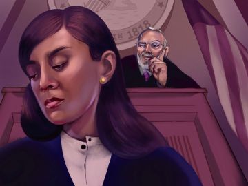 Alisa Holman dijo que recuerda una vez en la sala del tribunal de Vega cuando él la volteó a ver y le guiñó un ojo. Fue una de las muchas veces que dijo que Vega le faltó al respeto. (Ilustración de Verónica Martínez para Injustice Watch) Crédito: Cortesía