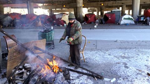 Un indigente se calienta frente a un campamento de personas sin hogar en Chicago. Crédito: AP