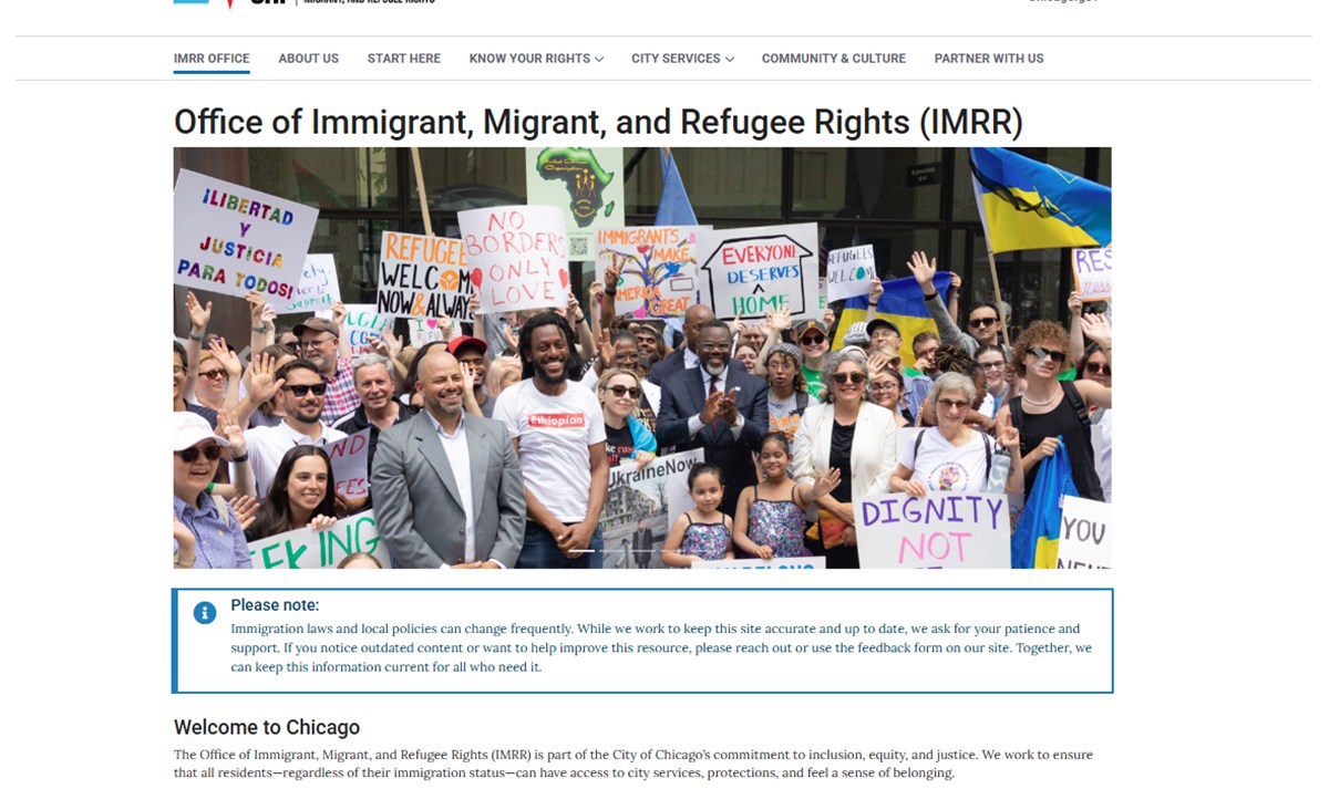 La portada del nuevo sitio web de la Oficina de Derechos de Inmigrantes, Migrantes y Refugiados (IMRR) de la Ciudad de Chicago. (www.chicago.gov/IMRR) Crédito: Cortesía