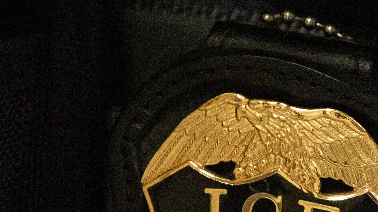 Un agente federal con una placa del Servicio de Inmigración y Control de Aduanas de Estados Unidos. Crédito: AP