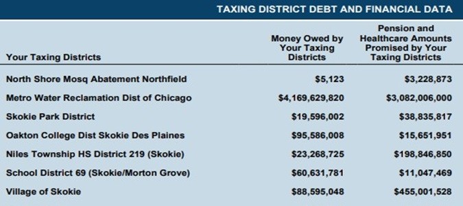 Es probable que la junta escolar y funcionarios municipales hayan emitido bonos para pedir prestados millones de dólares que se pagarán a lo largo del tiempo. Prácticamente todas las unidades de gobierno tienen deuda, incluidos los pasivos no financiados de las pensiones.